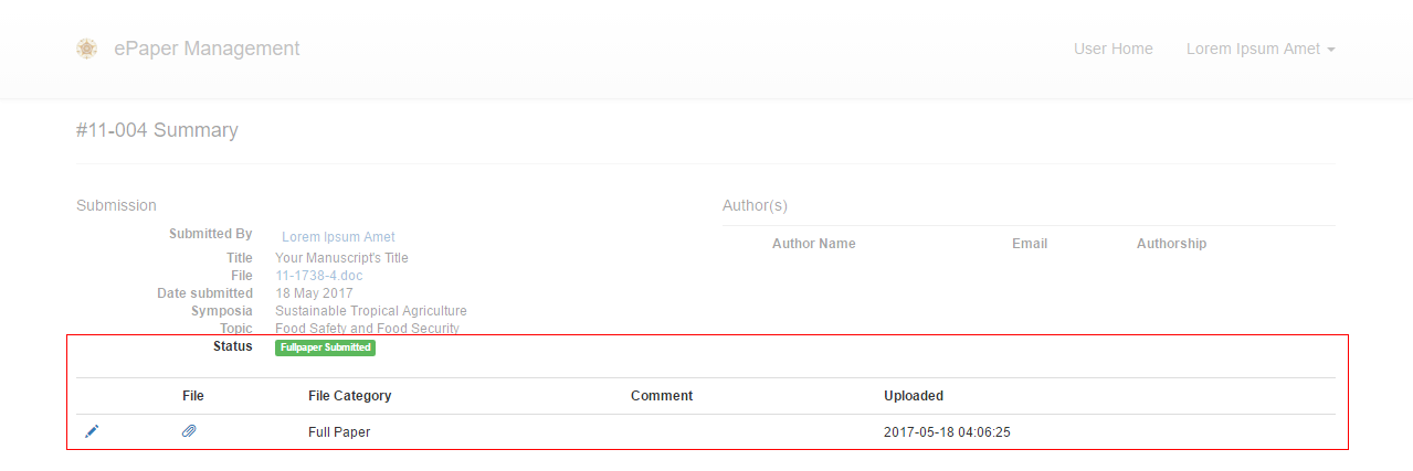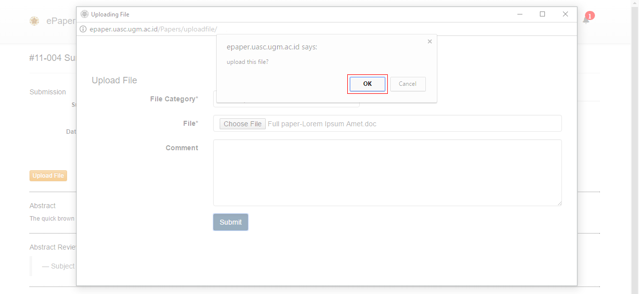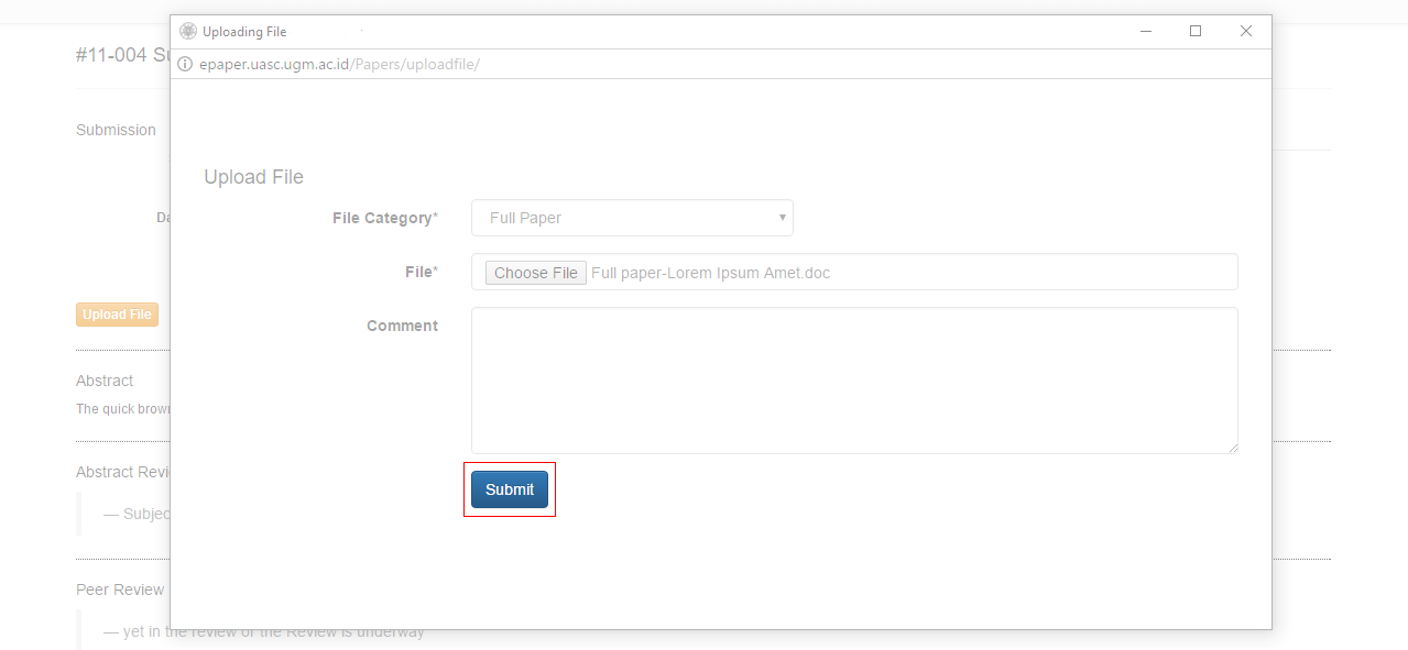 5. A new window will appear, through which you can upload your full paper. Once you have selected the File Category and attached your full paper, click Submit.
